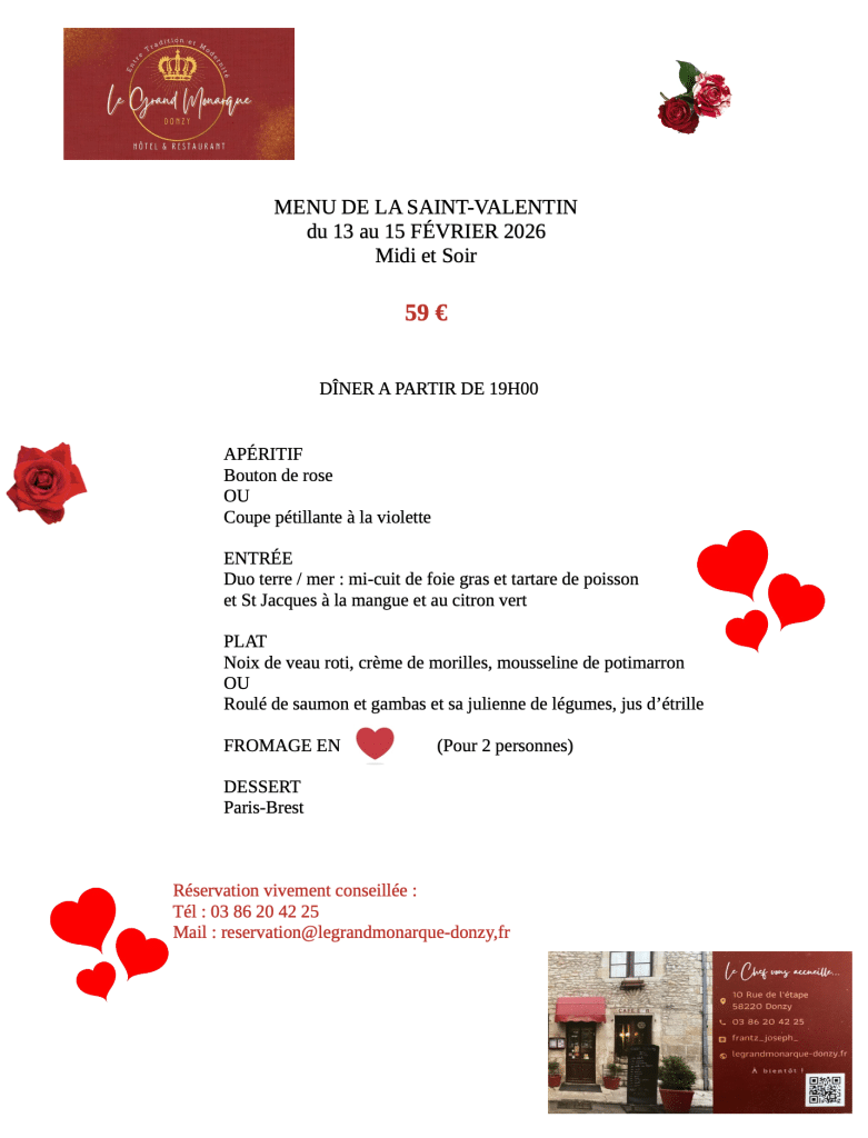 L’hôtel-restaurant est situé dans un quartier de charme, de tranquillité et dans une des plus jolies rues de Donzy avec ses maisons à pans de bois du XVIème siècle. Pour vous retrouver entre amis ou organiser vos réunions familiales, vos séminaires, banquets (également en extérieur, service traiteur) ou groupe de 40 personnes. Nous ne disposons d’aucune chambre accessible aux PMR ( personnes à mobilité réduite)